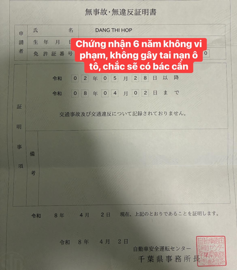 Ghi chú từ ảnh thực tế: Giấy chứng nhận trong ảnh cấp cho DANG THI HOP, xác nhận khoảng thời gian từ 28/5/2020 đến 2/4/2026 (gần đúng 6 năm) hoàn toàn sạch hồ sơ giao thông. Được đóng dấu bởi Văn phòng tỉnh Chiba của Trung tâm Lái xe An toàn Ô tô Nhật Bản – đây là tài liệu chính thống, có giá trị pháp lý.