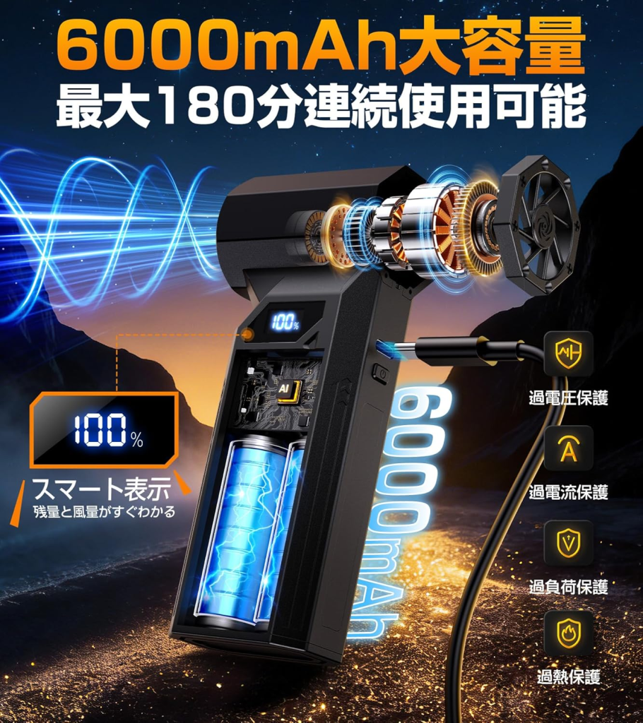 Pin 6.000 mAh – vệ sinh cả buổi không lo cạnDung lượng lớn đủ cho nhiều giờ vệ sinh liên tục. Sau 45 phút thổi bụi PC + bàn phím + điều hòa xe, pin còn hơn 60%. 4 mạch bảo vệ đảm bảo an toàn cho pin dài hạn.